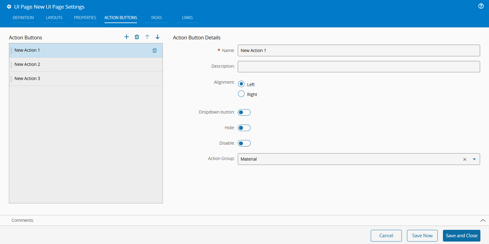 To a new button to the page you only need to define the Name. Optionally, you can provide the Description and Alignment (Left/Right). Also, available are the Dropdown, Hide, and Disable options as well as the Action Group setting.