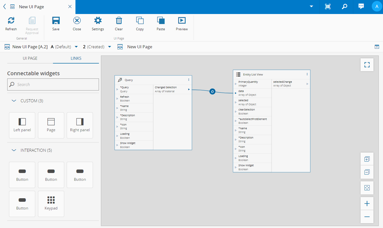 Additionally, you can connect the elements of the page (Page, Left panel, and Right panel) with either tasks or widgets. Similarly, the inputs and outputs that are directly connectable will be highlighted.