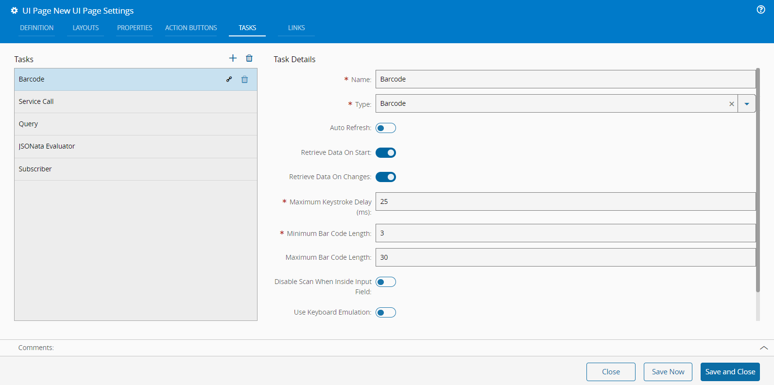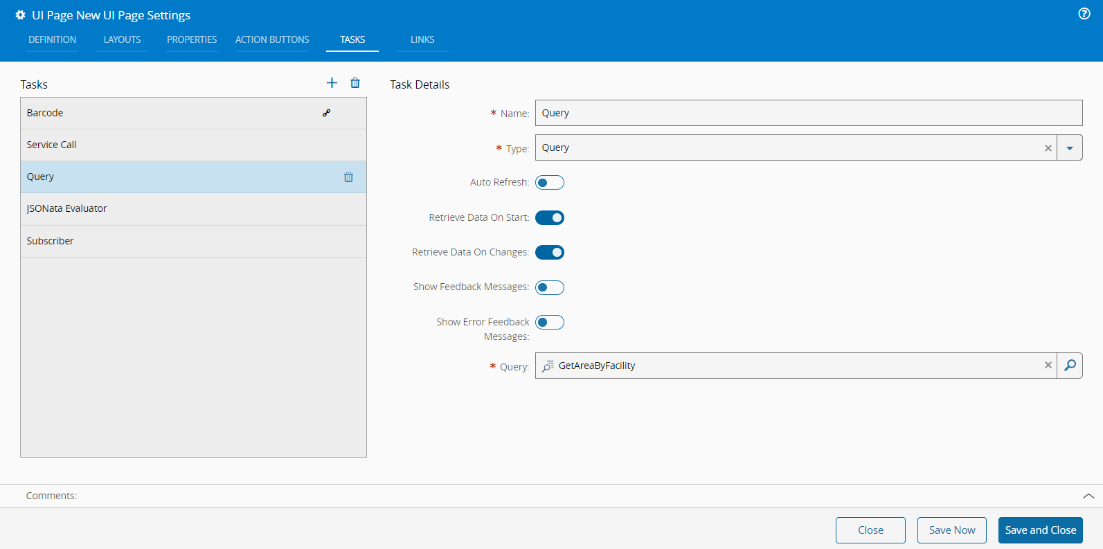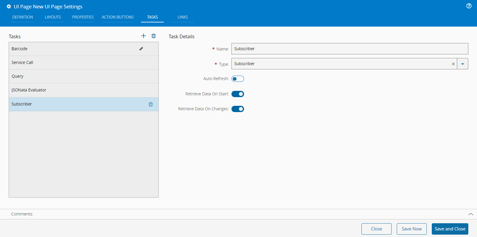 Tasks are elements used to fetch data from the system to feed data to other page elements. You can connect Tasks with the connectable items on the Links tab when you are building a UI Page. They are grouped by category and you can follow the links below to see more information on each individual Task.