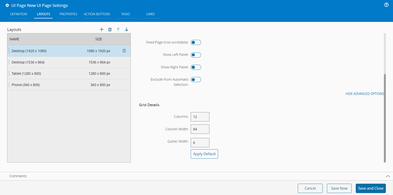 Additionally, you can or disable the following layout features: Fixed page (non-scrollable), Show left panel, Show right panel, and Exclude From Automatic Selection.