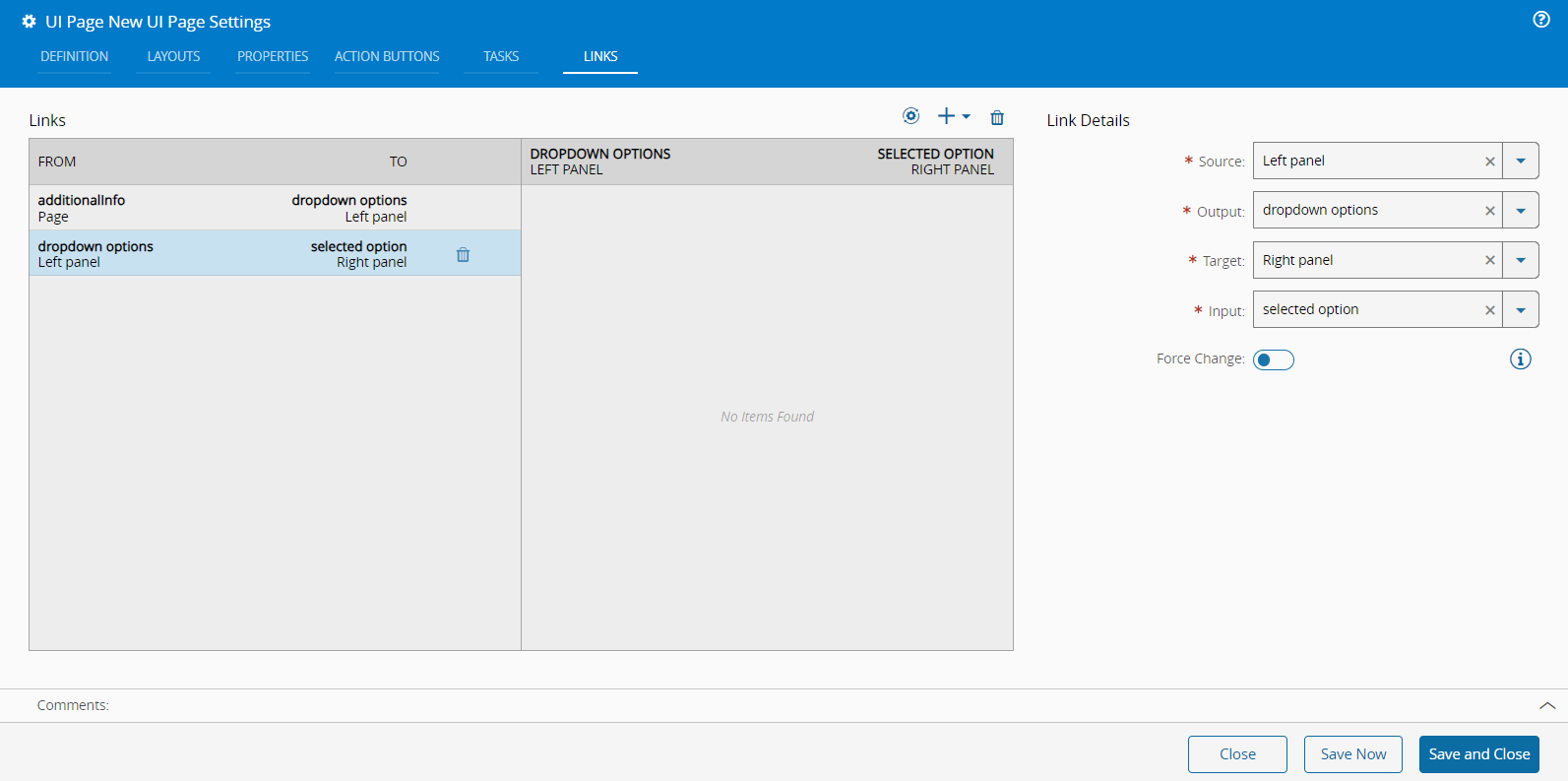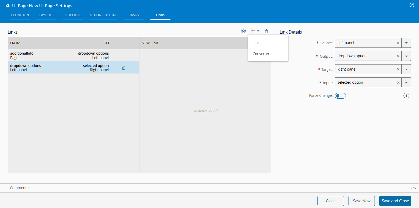 As shown above, the same mandatory fields â Source, Output, Target, and Input â apply here. The system ensures the appropriate fields are selected to match your configurations. You can add more Links by selecting the button. You can also add one or more Converters in the same dropdown menu. For more information, see UI Page Converters.