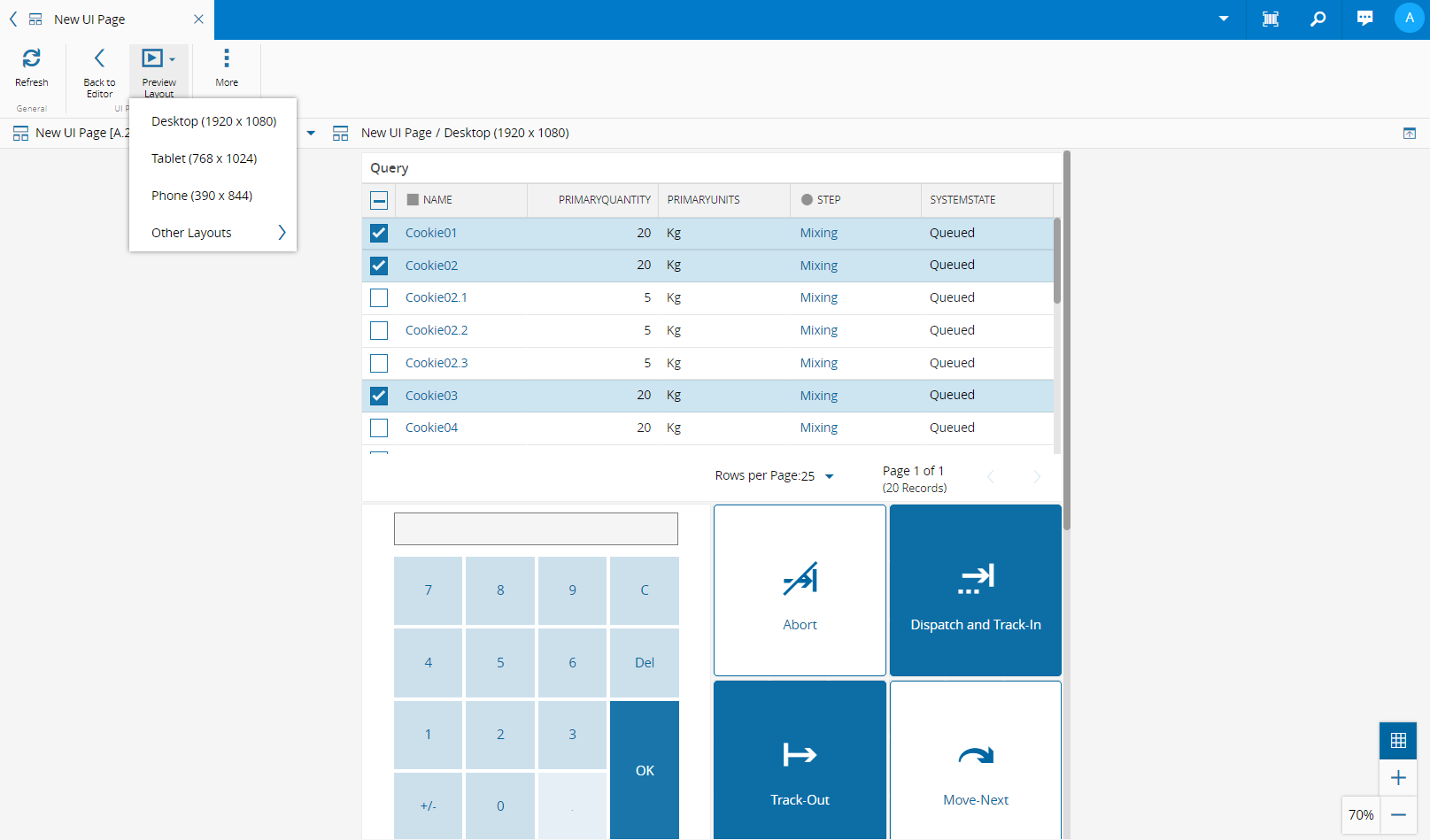 Select Preview from the top ribbon to see your UI Page. In Preview Mode, you can choose the layout from the Preview Layout dropdown menu. To continue editing the UI Page, select Back to Editor from the top ribbon.