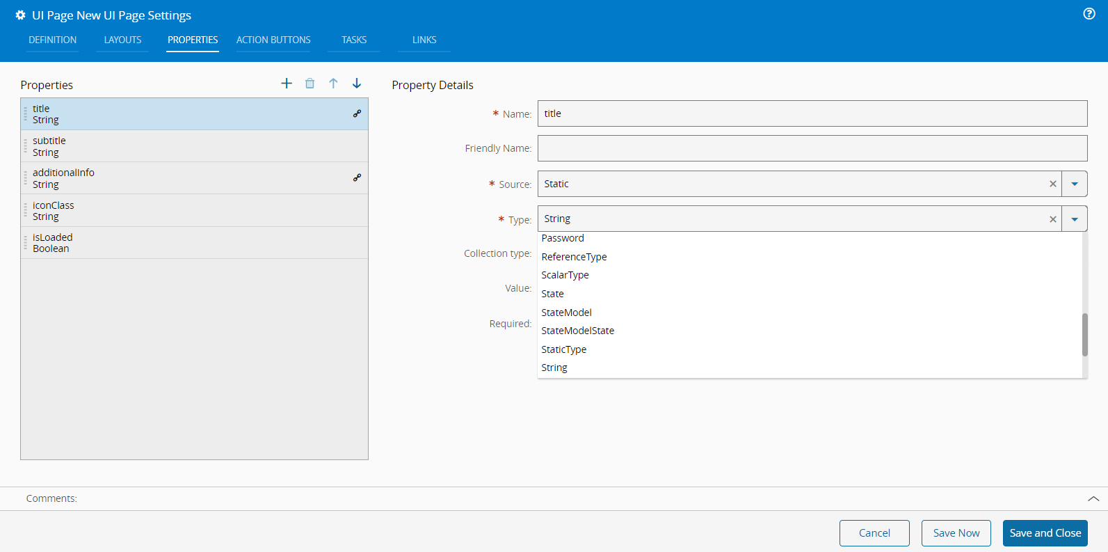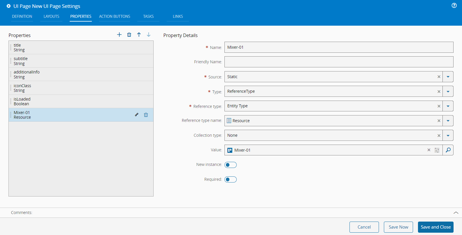 To add additional outputs to any elements of the page, you can use the Properties tab of the UI Page Settings wizard, accessible through the Settings button on the top ribbon. In the example below, an output of Entity Type, specifically a Resource with the value of Mixer-01, is added.