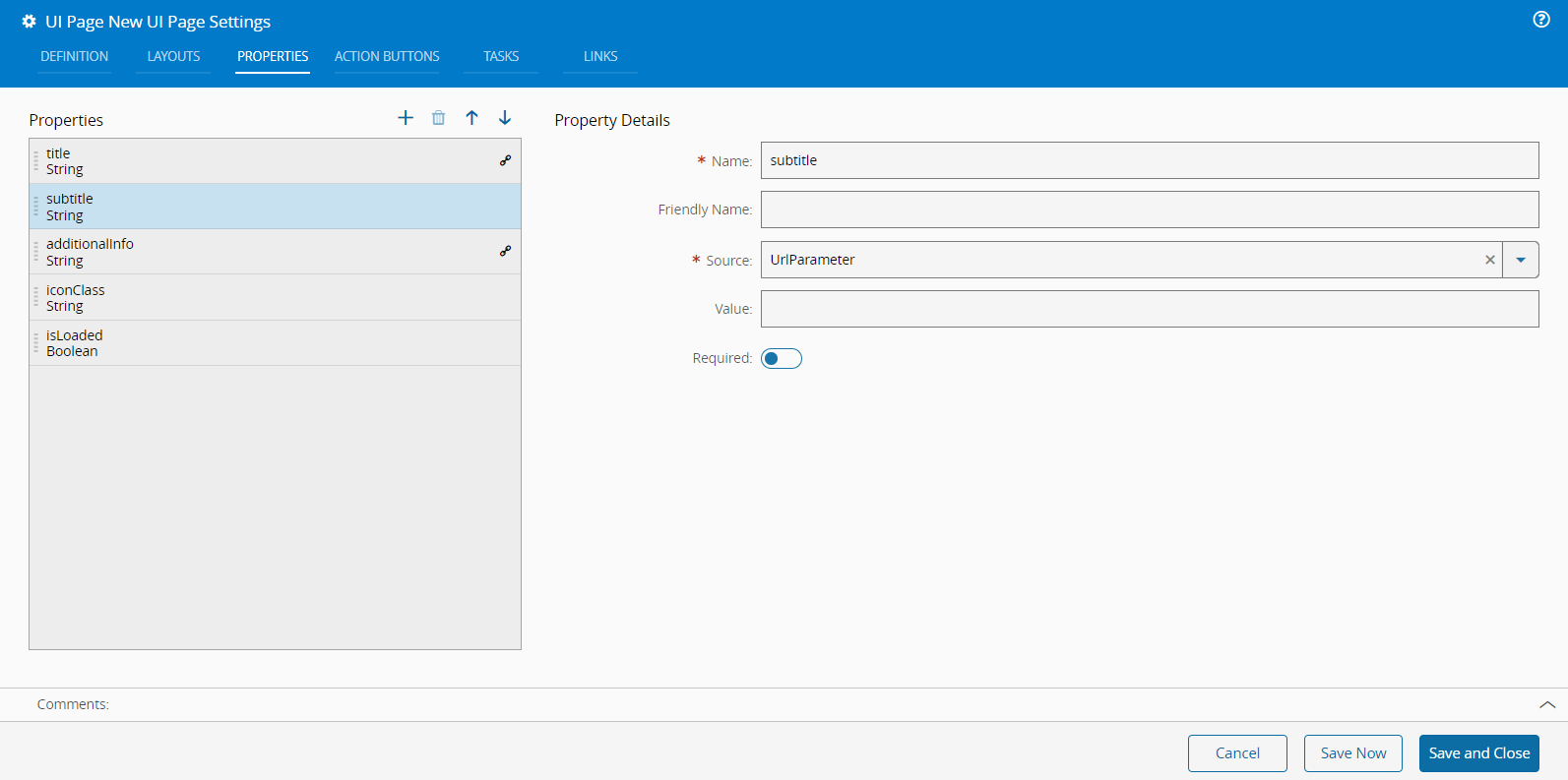 If the Source is URLParameter, you, optionally, need to define a Value and enable or disable the Required flag, which defines if the property is mandatory or not.