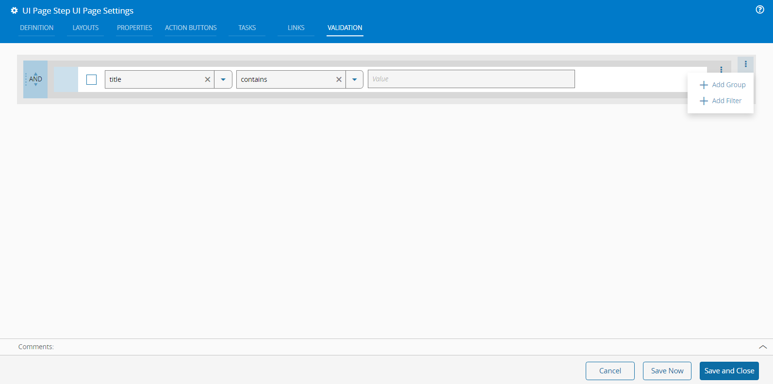 For the UI Page of type Step, the Validation tab allows you to create a Boolean expression that will be used by the system to validate the step: