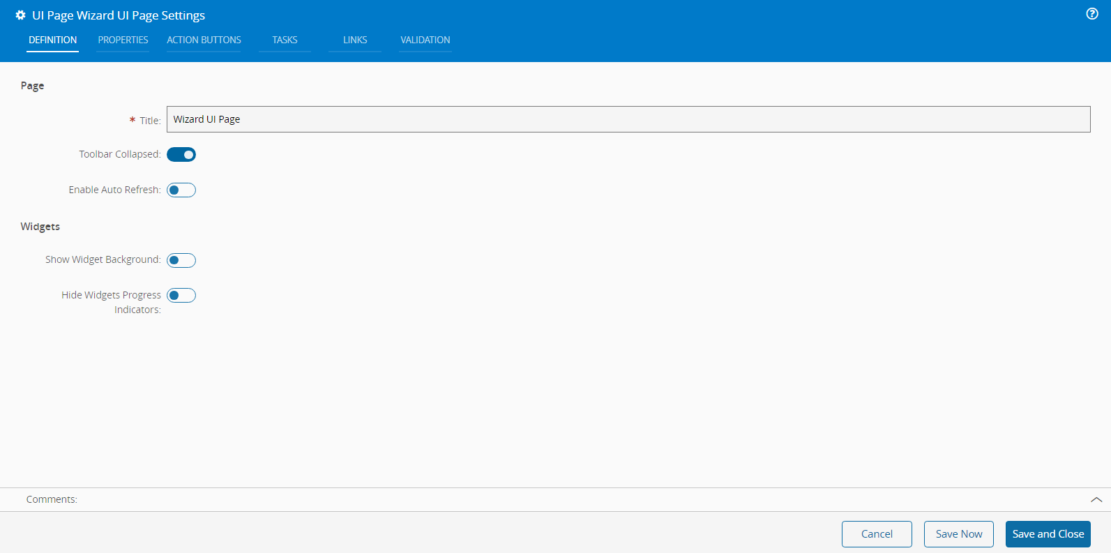 For the UI Page of type Wizard, there is also a Validation tab but there is no Layout tab as the layouts are managed by the system. The Show Grid Layout property is also managed by the system and cannot be set.