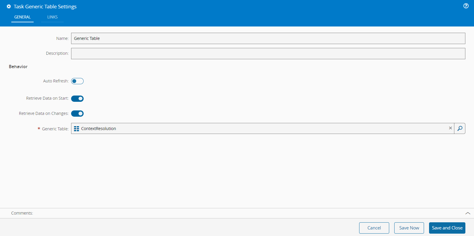 The Generic Table Data Source allows you to use predefined generic tables within the MES system. To configure this type of data source, you need to provide a name and, optionally, a description. You can customize its behavior by adjusting the following settings: