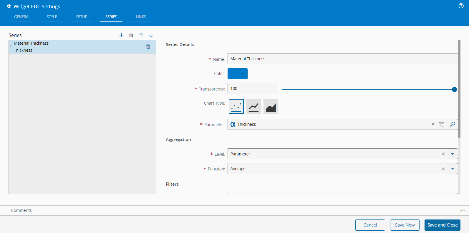 - Filters - you can define the context that should be used as a filter for the data to be displayed for the current series. The available filters are: