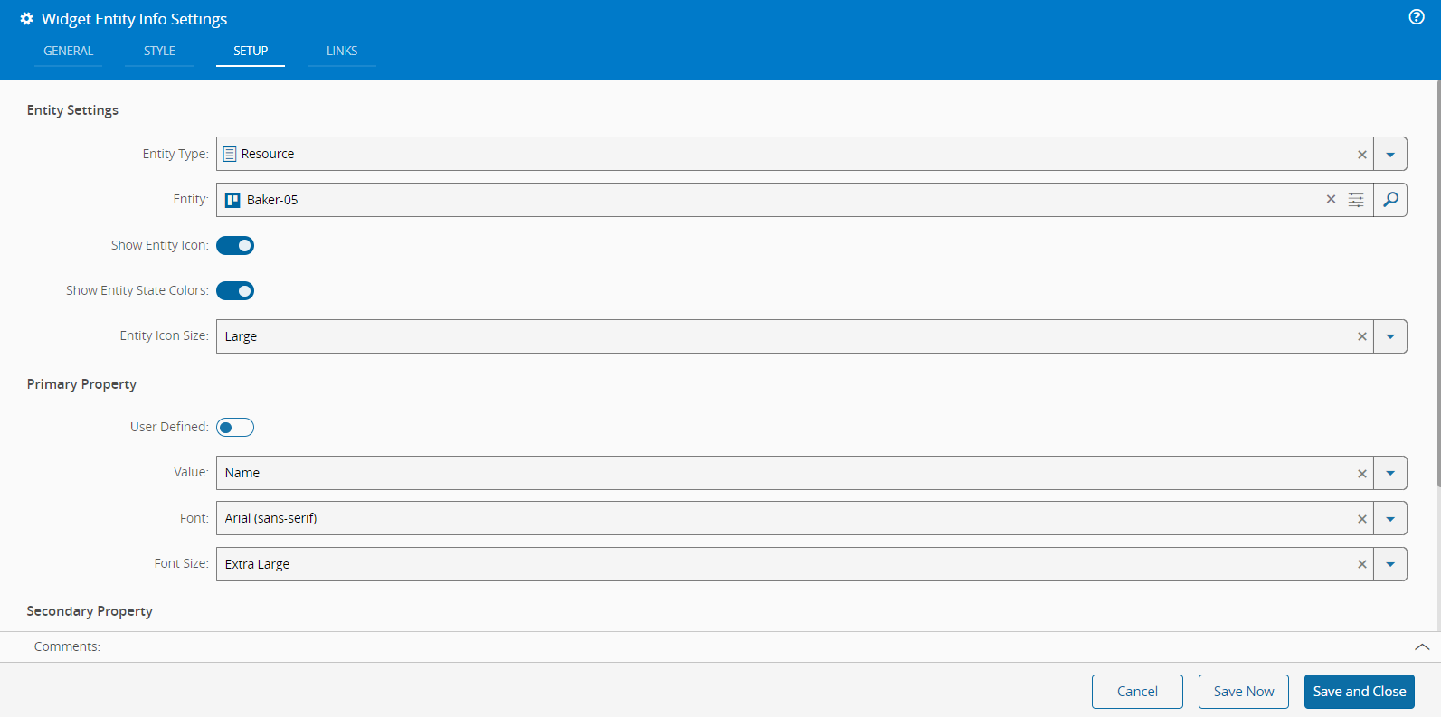 The Entity Info widget displays quick information on a given entity instance, with a primary and a secondary property available to be displayed.