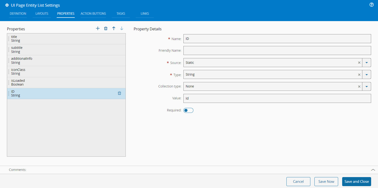 To use the an entity parameter in a Query requires the actual database ID to be provided via the link on the UI page. To accomplish this, a string property has to be added to the page: