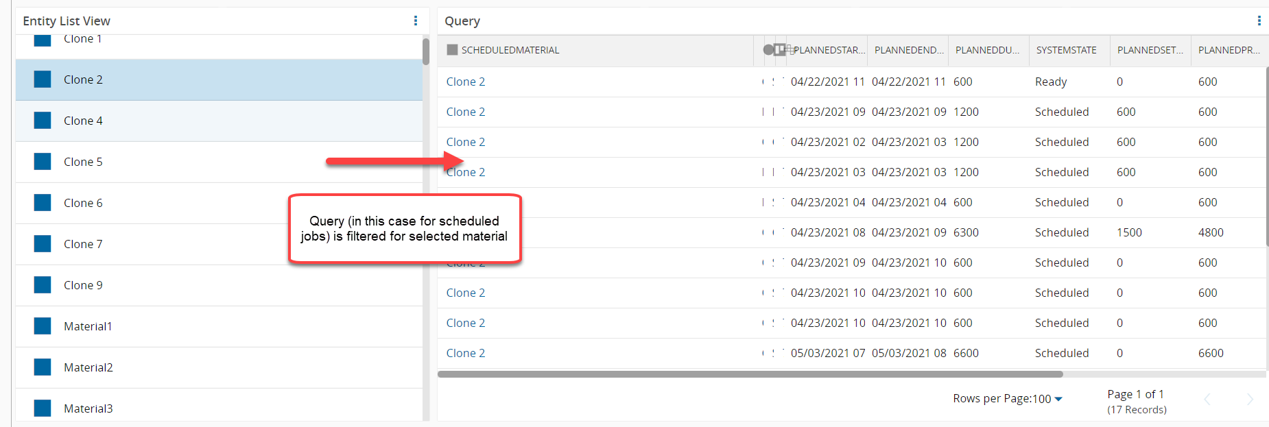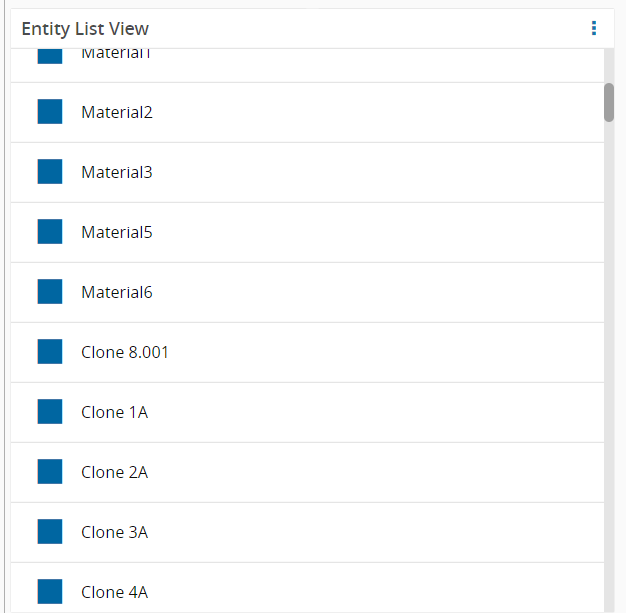 After saving, the Entity List widget will display a scrollable list of Materials:
