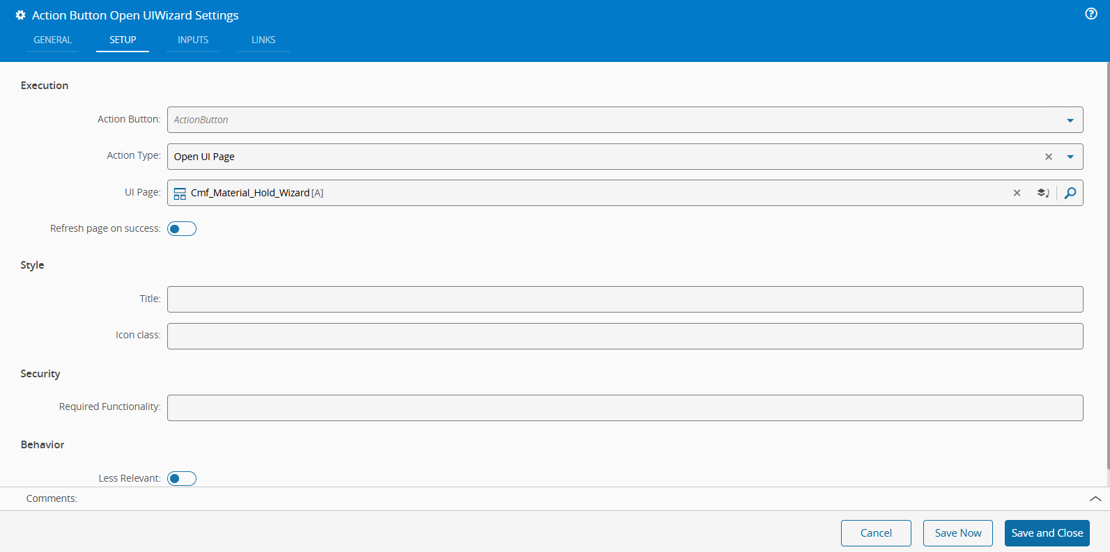 In the Action Buttons Settings for the Open UIWizard button, navigate to the Setup tab, and choose the Open UI Page Action Type. Additionally, specify the target UI Wizard (for example, the