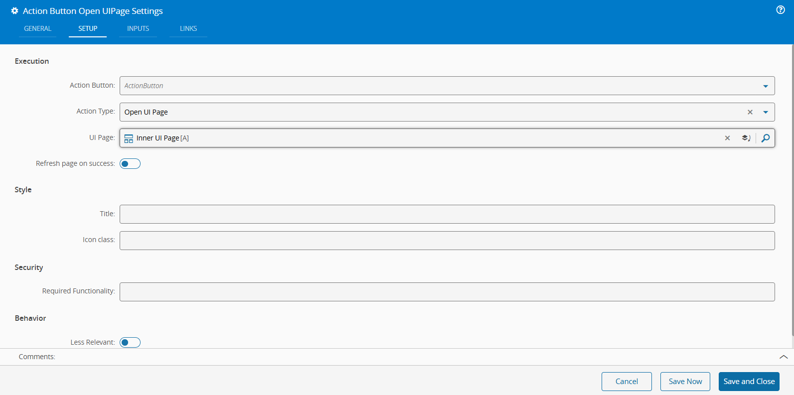 In the Action Buttons Settings for the Open UIPage button, navigate to the Setup tab, and choose the Open UI Page Action Type. Additionally, specify the target UI Page (for example, the