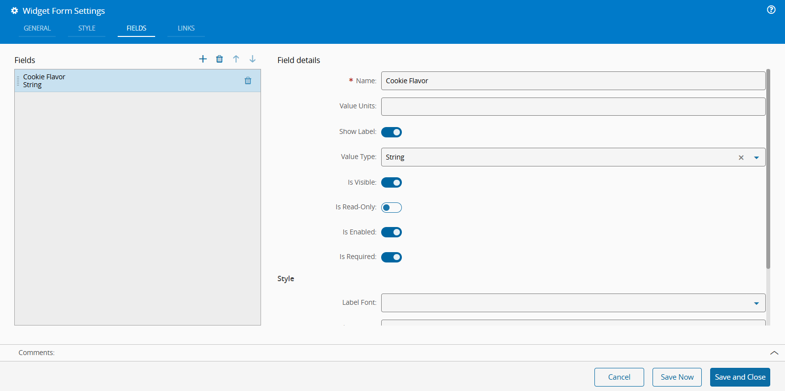 Configure the Form widget by adjusting the General Settings and defining the Fields as displayed below. For more information on this widget, see Form.
