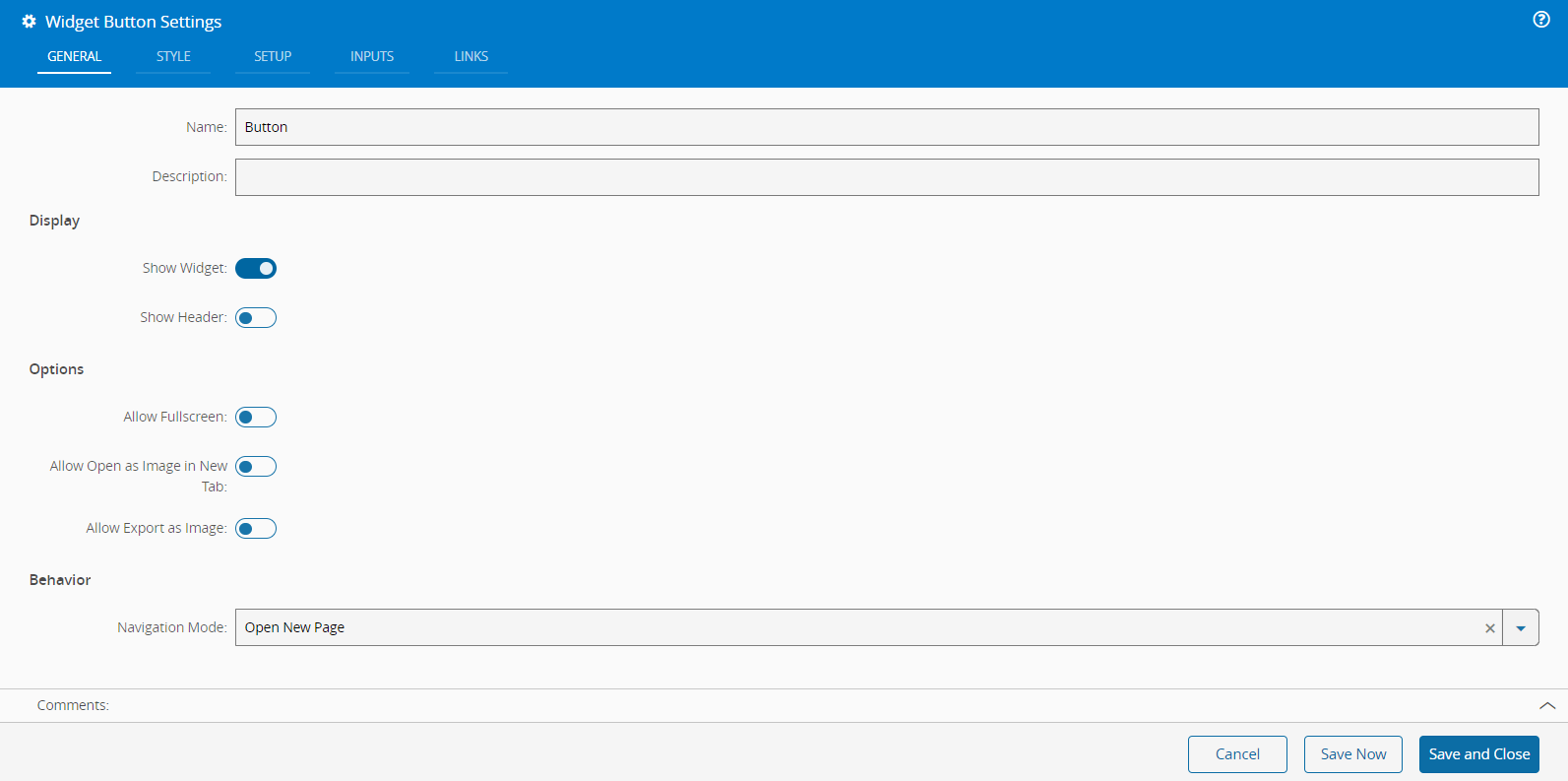 - In the General tab, provide a name and a description for the widget. Use the toggle buttons to specify whether the widget should be visible, display the header, or allow full screen mode. Additionally, determine if the widget can be opened as an image in a new tab or exported as an image. You can also select the navigation mode behavior: open a new page, replace the current page, or none.