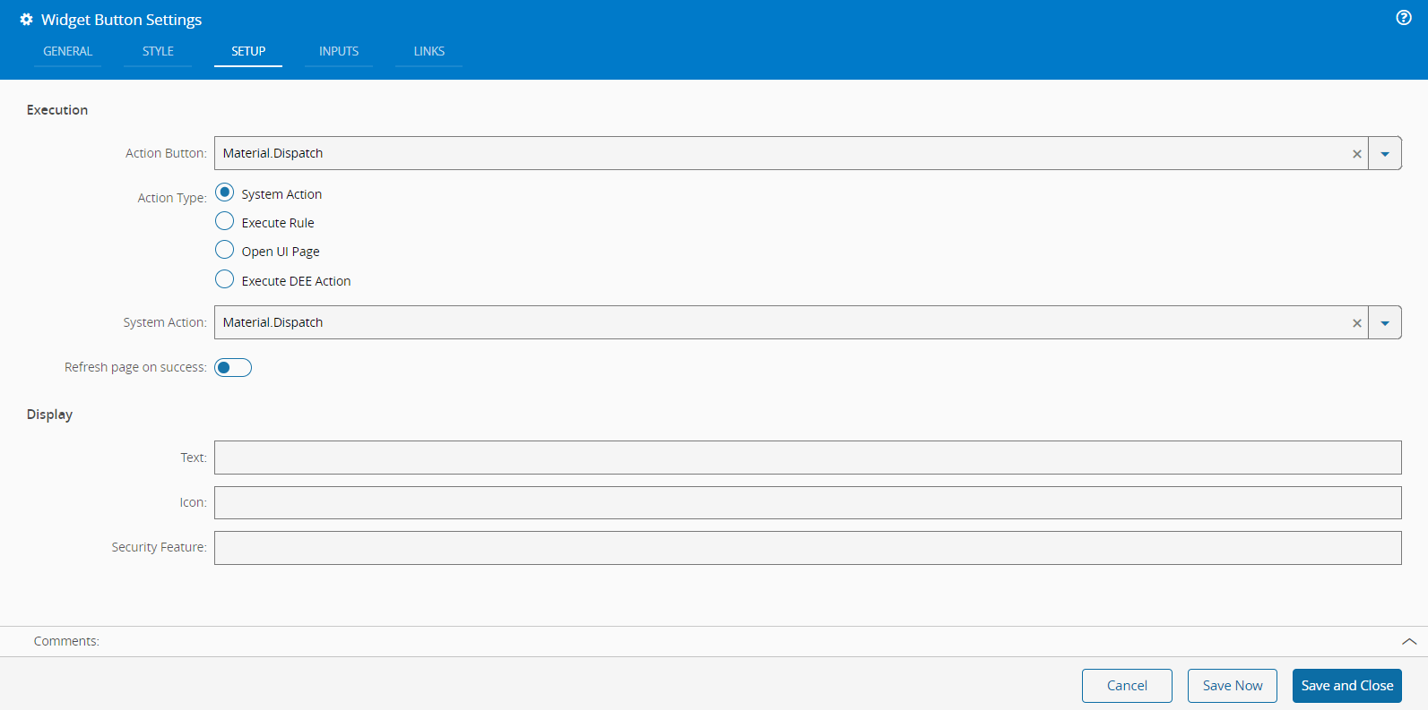 Material.Dispatchas both the Action Button and System Action to automatically fil in the Inputs tab.