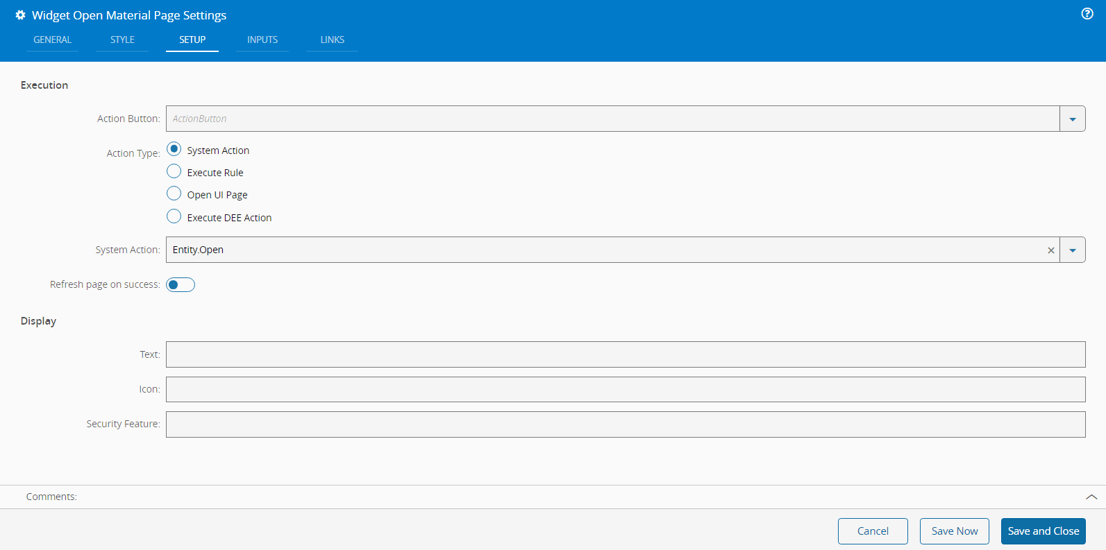 In the Setup tab, you can configure the button to perform one of four types of actions: System Action, Execute Rule, Open UI Page, or Execute DEE Action. For each Action Type, the system will show you the different options available, as shown in the images below. You will also be able to customize the Action Button even further by specifying the following options: