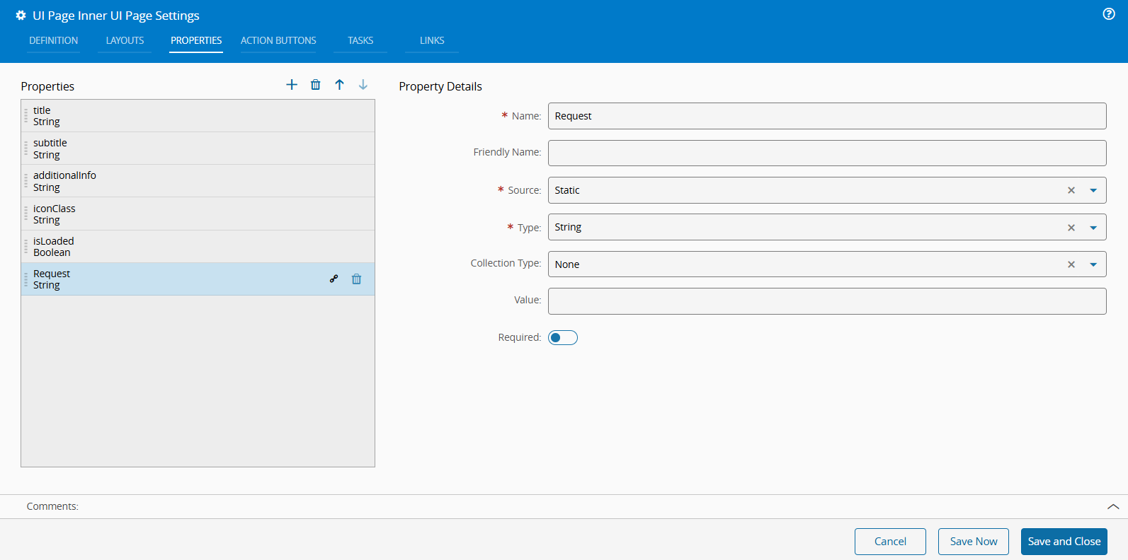 Use the Properties tab in the UI Page Settings to define a property similar to the one created in the Form widget.