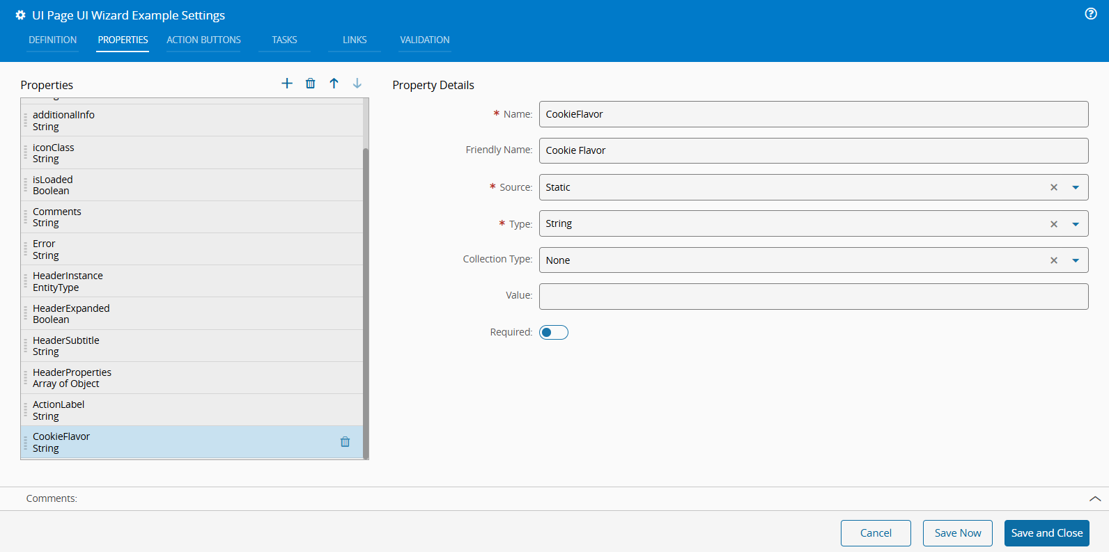 Use the Properties tab in the UI Wizard Settings to create a property similar to the one defined in the Form widget.