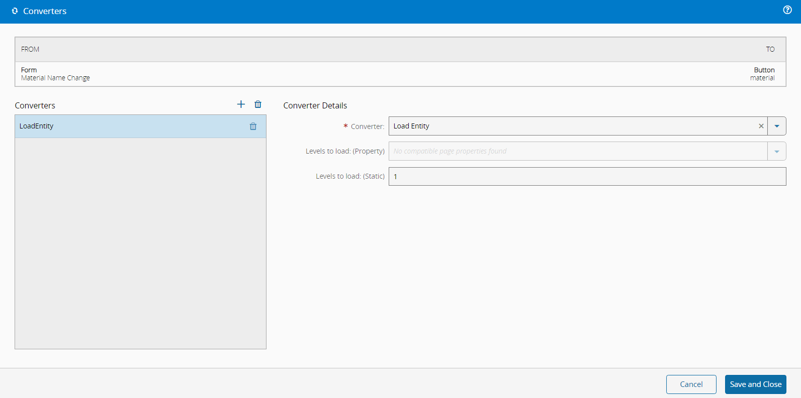 To connect the Dispatch Button widget to the Form widget, configure a Load Entity Converter. For more information, see UI Page Converters.