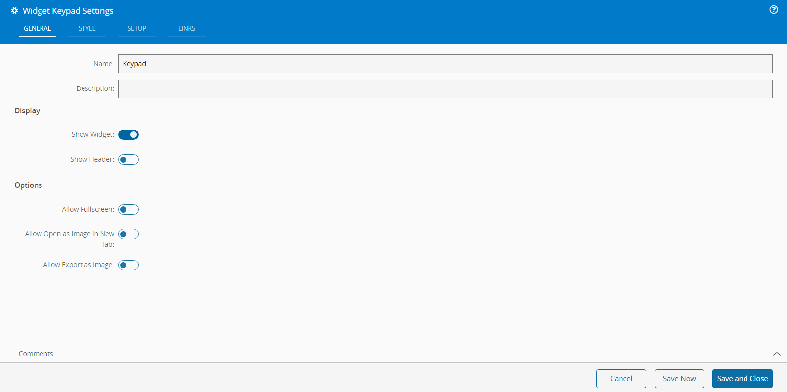 - In the General tab, provide a name and a description for the widget. Use the toggle buttons to specify whether the widget should be visible, display the header, or allow full screen mode. Additionally, determine if the widget can be opened as an image in a new tab or exported as an image.