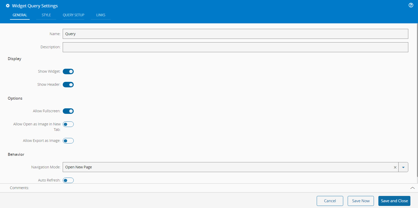 - In the General tab, provide a name and a description for the widget. Use the toggle buttons to specify whether the widget should be visible, display the header, or allow full screen mode. Additionally, determine if the widget can be opened as an image in a new tab or exported as an image. You can also select the navigation mode behavior: open a new page, replace the current page, or none.