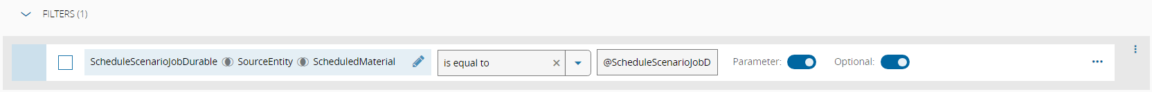 Setup an entity parameter on the Query: For example, a Material entity for a Scheduled Scenario Job Query: