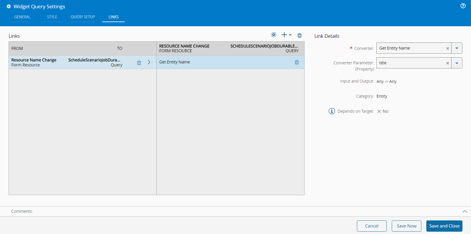 Setup an entity parameter on the Query: For example, a Resource name for a Scheduled Scenario Job Query: