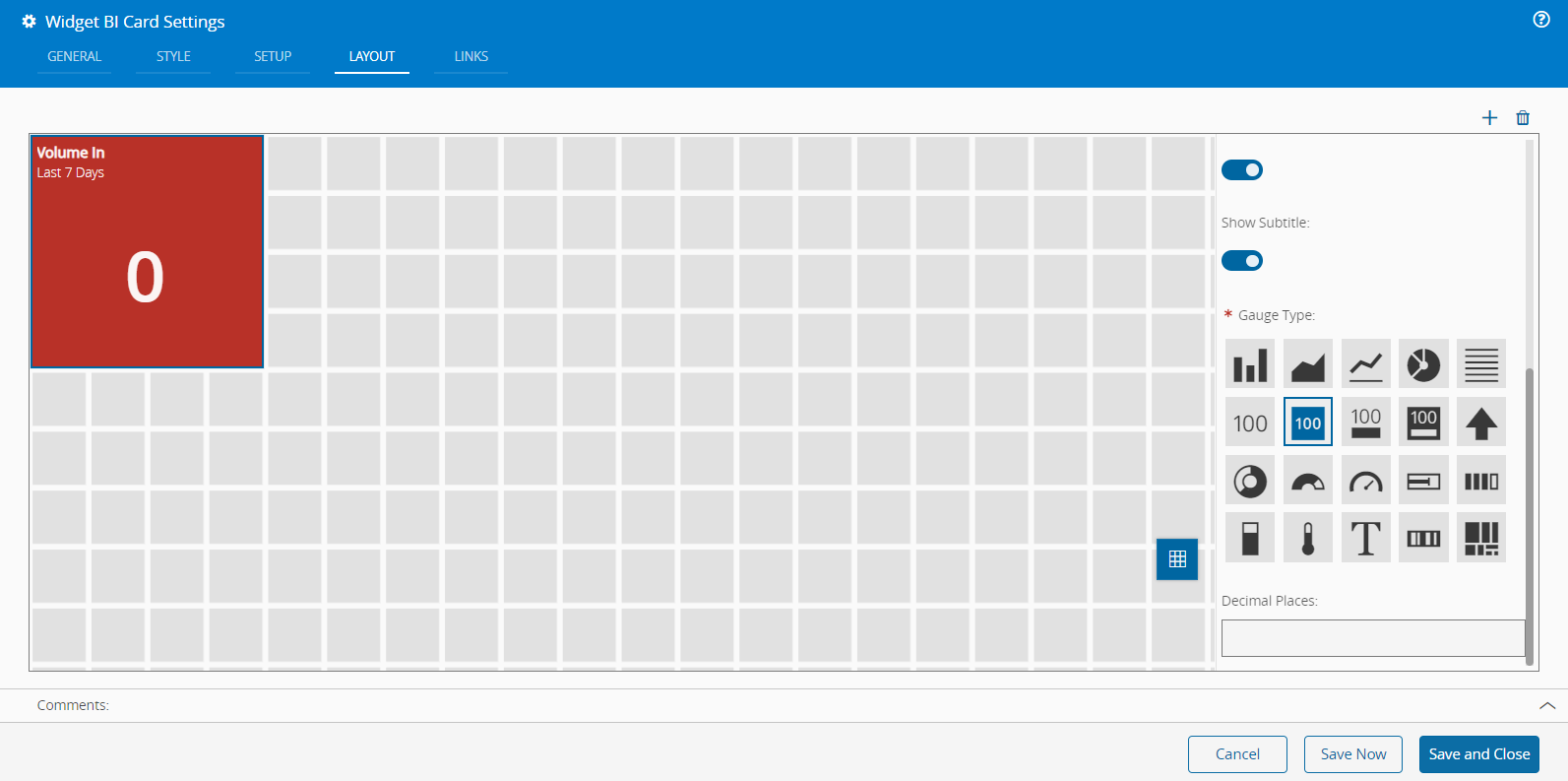 trueby default. - Gauge Type - Select the graphic representation for the BI Card from the available gauge types to display the data. Depending on the gauge type selected,additional options may become available. For more information on gauge types, see the Data Value widget page.