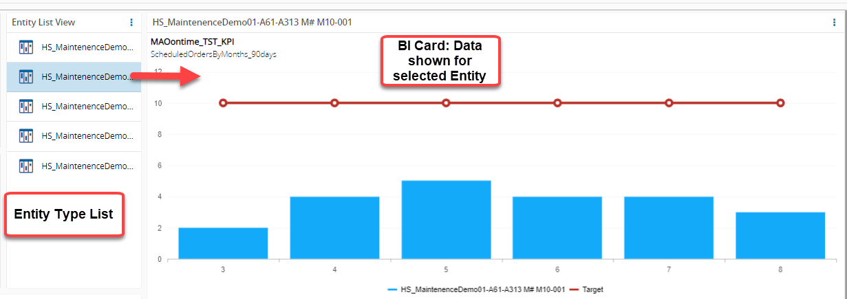 A BI Card can be linked to show data for a specific entity, such as one provided as input from an Entity List widget.
