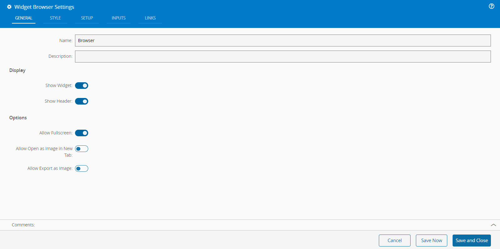 - In the General tab, provide a name and a description for the widget. Use the toggle buttons to specify whether the widget should be visible, display the header, or allow full screen mode. Additionally, determine if the widget can be opened as an image in a new tab or exported as an image.