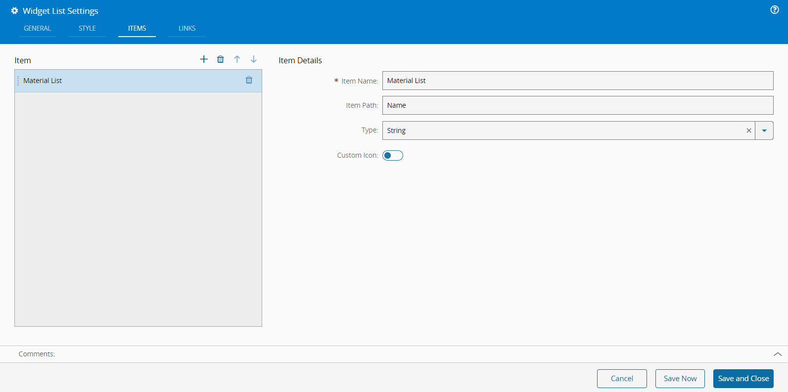 In the Items tab, provide the following properties: