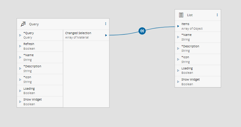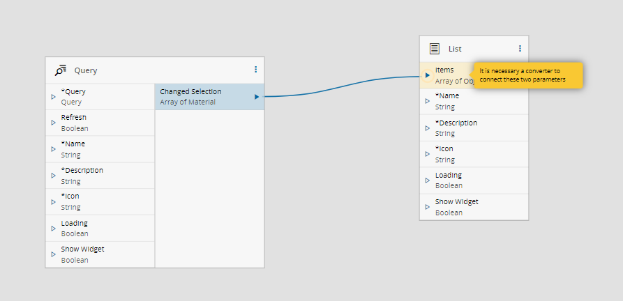 Change Selectionoutput on the Query widget to theItemsinput on the List, as displayed below.When connecting both fields, a pop-up wizard might appear for configuring the Converter settings. In the example below, the Converter used was the