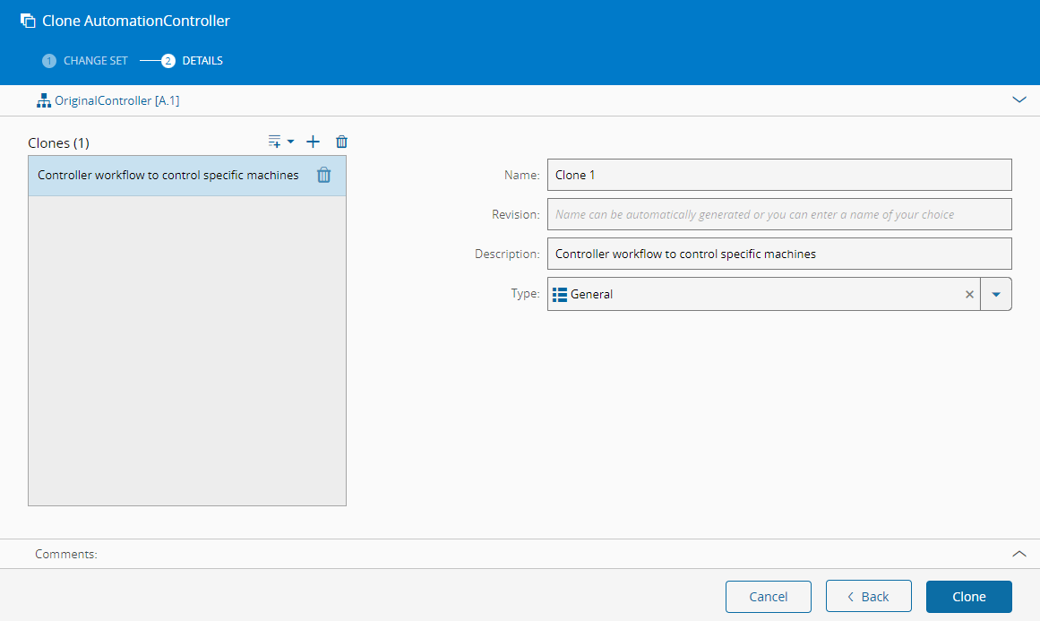 The Clone Automation Controller wizard can be called from the Automation Controller page within the Business Data Group. The default values will be taken from the current Automation Controller to be used as a base for the new object. Since this is a versioned entity, there are two possible procedures: entity and revision cloning, both of which are available from the main details page. Select Clone on the top ribbon, followed by Entity if you want to clone the complete entity along with the first revision and version of the new entity, or Revision if you want to clone only a single revision. In either case, a Change Set must be supplied for a version of the revision to be made effective in the future.
