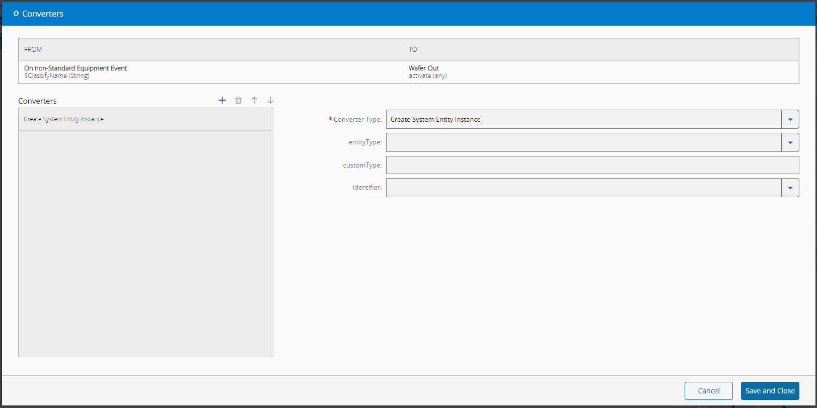 This converter creates a MES object skeleton only with the name or ID defined as the input value. It natively supports the entity types Resource, Container, Material, Data Collection, but can also receive custom types. The custom type overrides the entity type. The identifier of the object can be either the Name, or the ID.