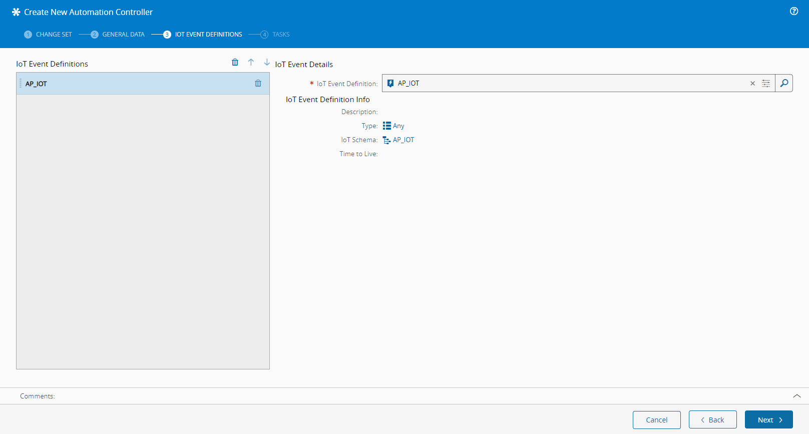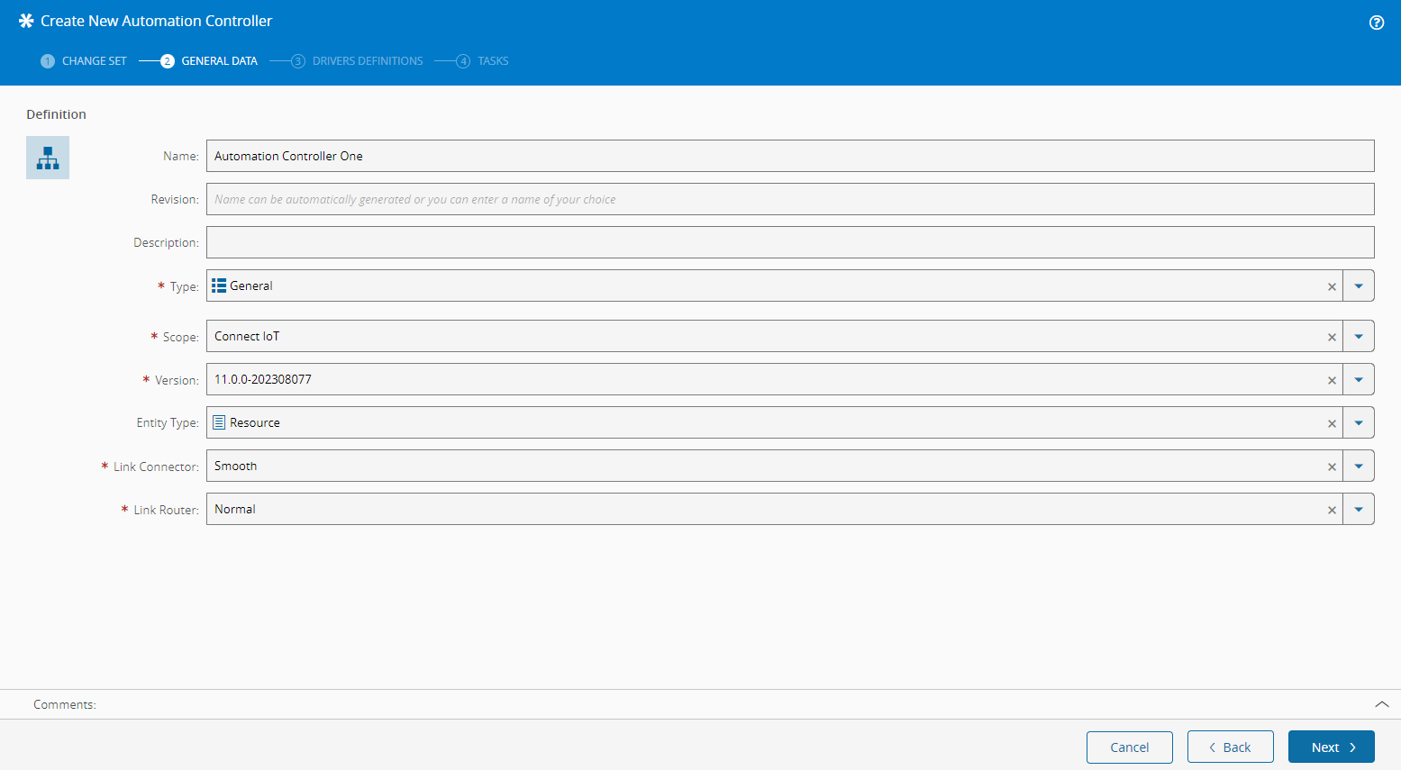 - If the Scope is Connect IoT, select from the available Automation Driver Definitions. The following attributes should also be added: