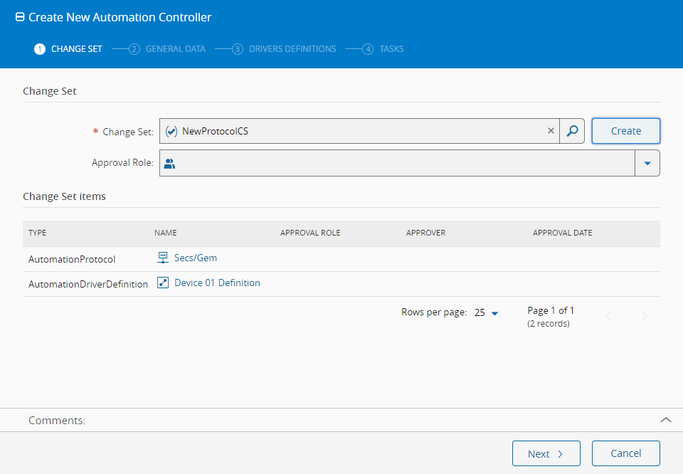 On the first page, it is required that the Change Set field is defined (or bypassed if such setting is already defined in the Entities' Administration).