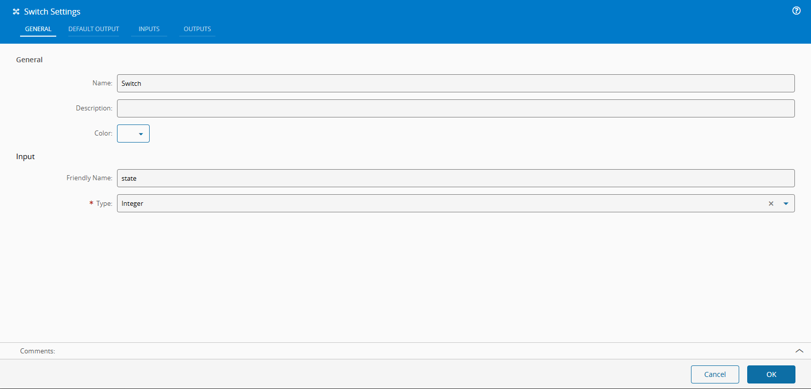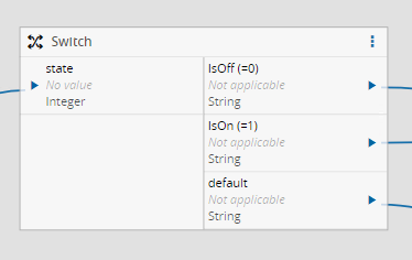 The switch task works as the switch statement in most programming languages. There is an input value, one or more possibilities and optionally, a default (if no possibility is a match). The switch task allows you to also define what value and type will be emitted if a match is found. The output types can be different.