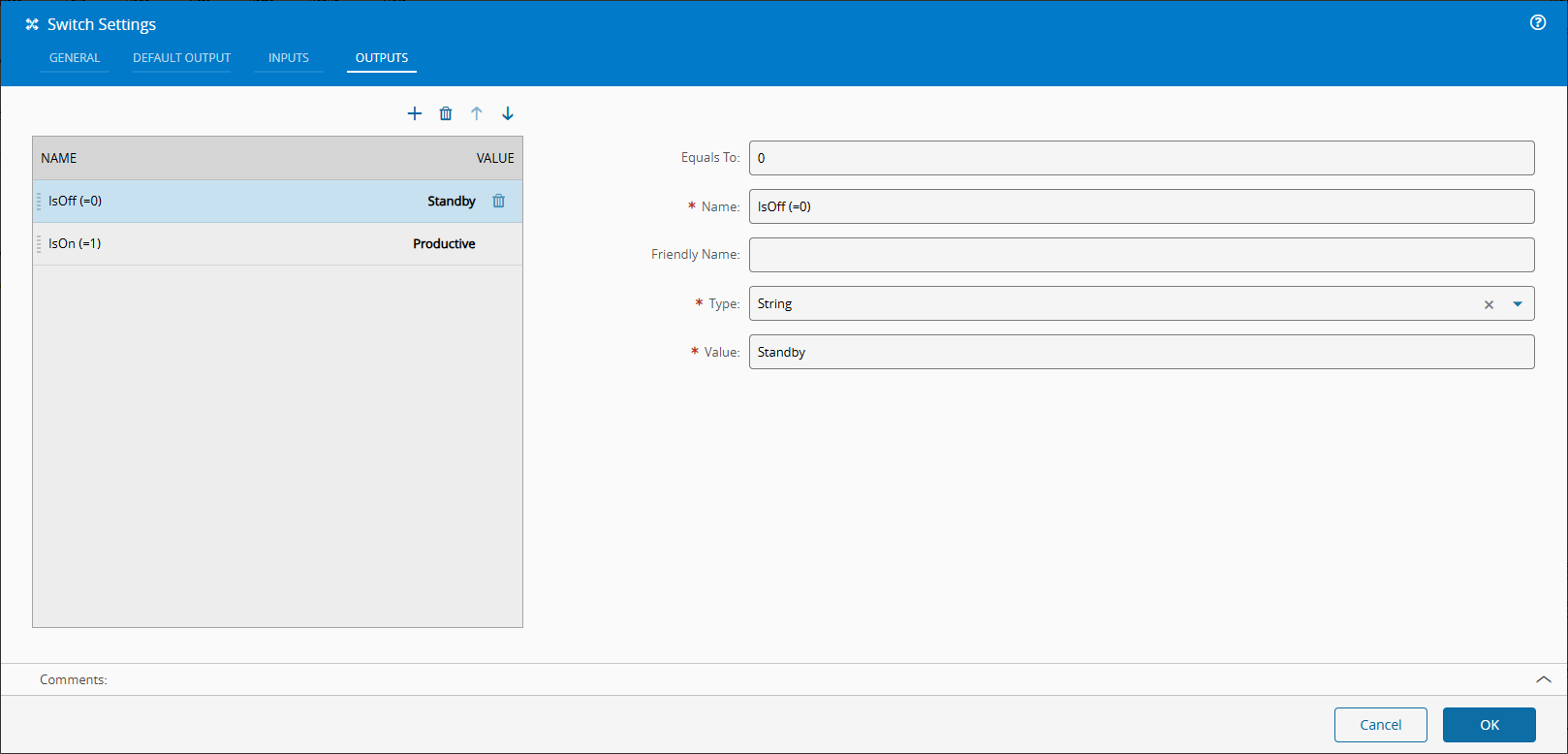 | default (can be changed) | <custom> | Value and type to emit if none of the outputs listed in the <custom list> matches with the input value |