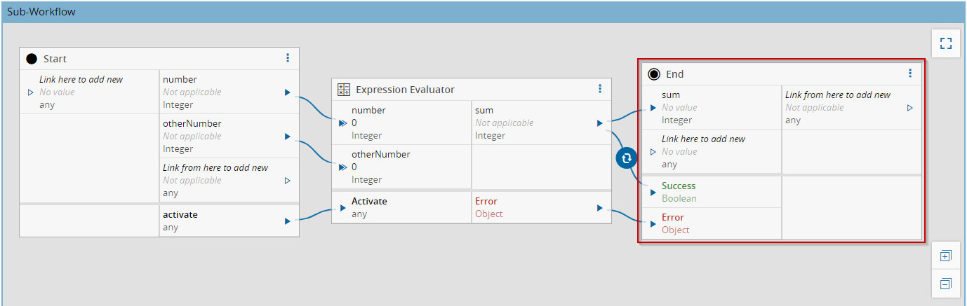 | Error | Object | True | Terminate the execution of the sub-workflow with an Error result |