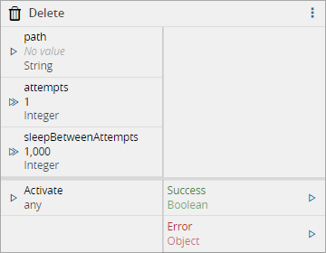 Upon activation, will send a Delete command to the driver where it will try to delete the path location (file or directory). If it fails, will retry attempts times, waiting sleepBetweenAttemptsmilliseconds each time.