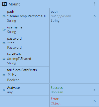 Upon activation, will send a Mount command to the driver where it will try to mount the network path provided in the pathparameter, using (optionally) the username and password. It will map it into the localPath location using a symbolic Link.