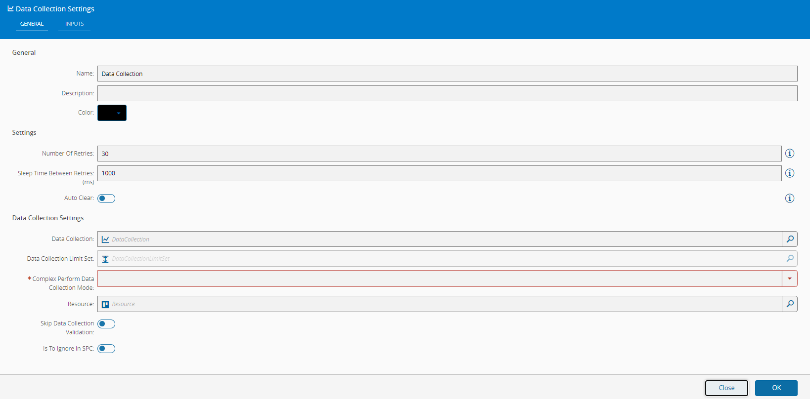 | Complex Perform Data Collection Mode | Enum | Perform to All Materials in Resource Perform to First Material in Resource Perform to MaterialPerform to Resource | Selected mode used to perform the DataCollection | |