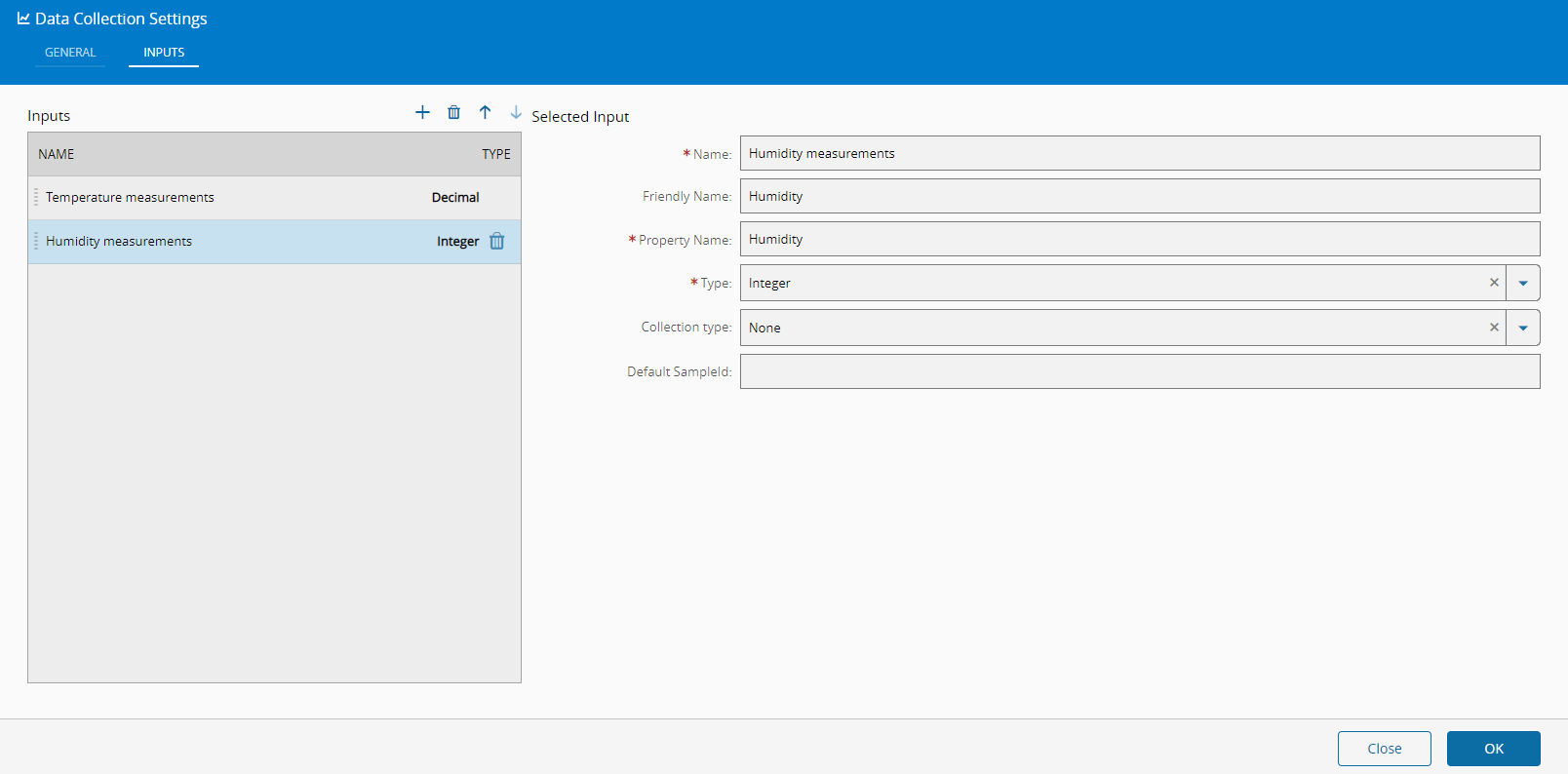 On the Inputs Tab you can add as many rows as desired (each row represents a new Input to be added to the currently selected Data Collection task) by pressing in the top right of the grid and pressing to remove any added entry. For each new Input, define: