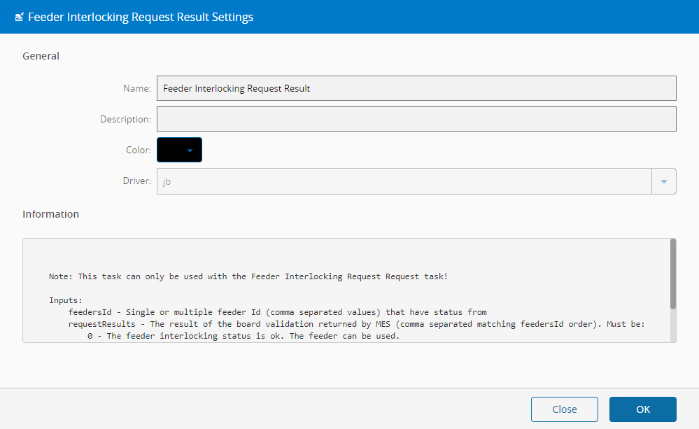 | requestResults | String | The result of the board validation returned by MES. Must be:0 (OK) The feeder interlocking status is ok. The feeder can be used.1 (NotOk) The feeder interlocking status is overdue.This is a comma separated value string for all the FeedersId | |