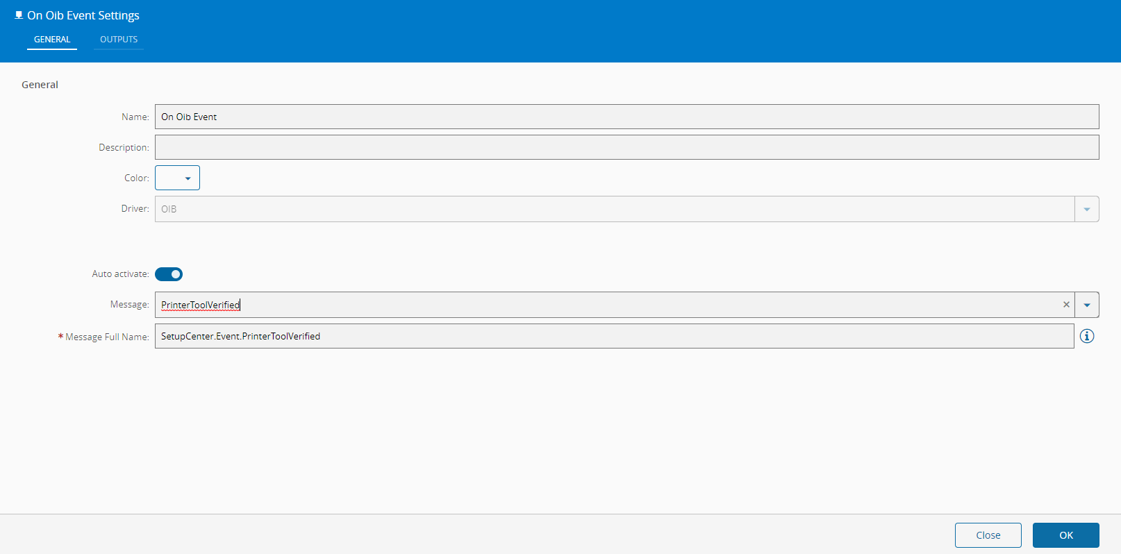 The On OIB Event Task is specific to be used with the OIB Driver. This task receives event OIB messages of a specific type, which can be configured in the Task settings. The Task's static and dynamic outputs are updated after each event received.