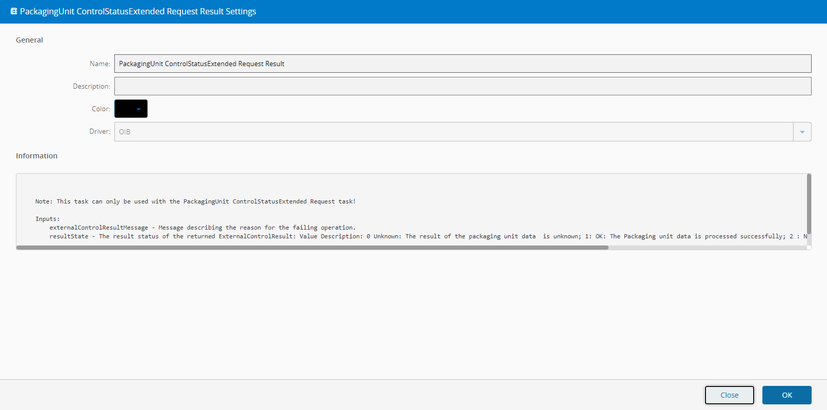The PackagingUnit ControlStatusExtended Request Result task uses the GetPackagingUnitControlStatusExtended() method on ISiplaceSetupCenterExternalControl interface.