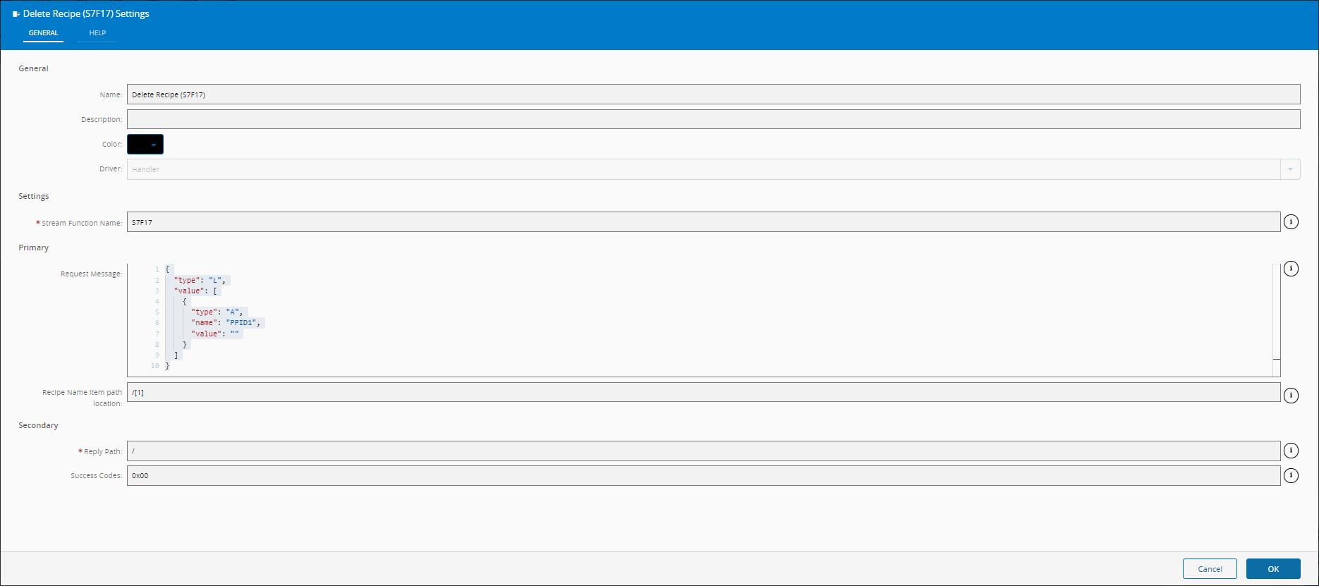 | Recipe Name item path location | String | /[1] | Item path location, on primary message, where Recipe Name input should be inserted. If empty no substitution is performed and primary message is sent as is. | |