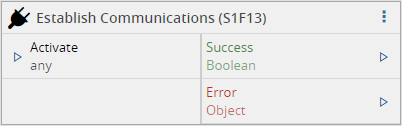 Upon activation, will send an S1F13 (Establish Communications) message to the driver of the equipment. If the reply matches what was expected in the correct path and with the correct success code, the task will emit a value true on the Success output. In case of the task , for some reason, is not able send the message or if it receives an unexpected reply, an Error is emitted.