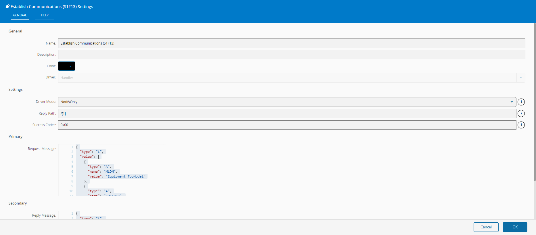 | Reply Message | Object | { "type": "L", "value": [ { "type": "BI", "name": "COMMACK", "value": 0 }, { "type": "L", "name": "L2b", "value": [ { "type": "A", "name": "MLDN", "value": "Equipment TopModel" }, { "type": "A", "name": "SOFTREV", "value": "Software Rev 1.0" } ] } ] } | Enabled when Driver Mode is different of NotifyOnly. Secondary/Reply Message to send |
